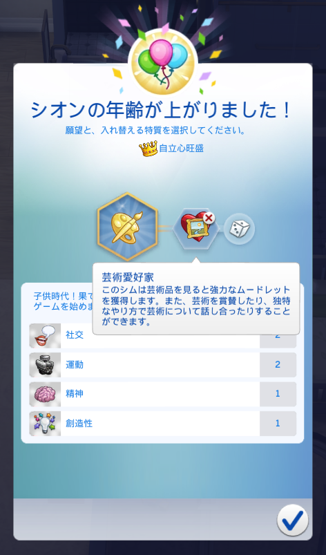 アイルは新たに不器用がつきました。これ、わたしは可愛くてけっこう好きなんですよね。時々歩いてて滑って転びそうになってたりして。